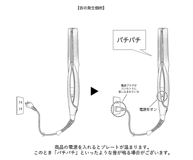 「パチパチ」「バチバチ」「チリチリ」という音は、アイロンプレート付近の製品内部の部品が温度変化によって膨張・縮小する際に生じる音で、特に昇温時には温度が大きく変化するため、音が大きくなる傾向があります。