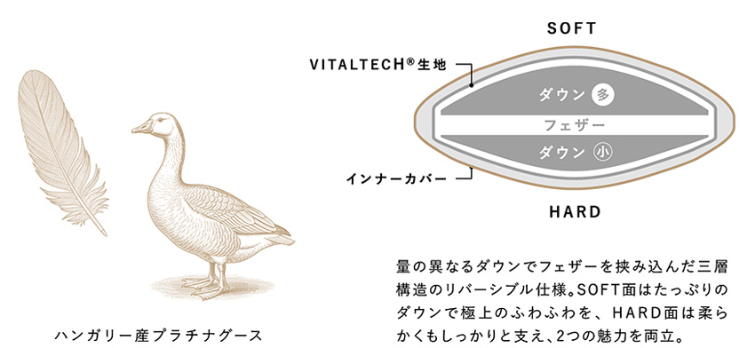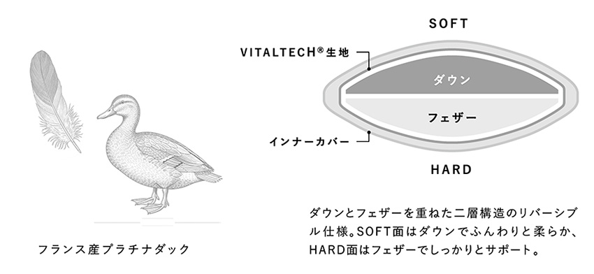 ダウン・フェザーの二層構造で適度な弾力と柔らかさを両立したリバーシブル仕様。