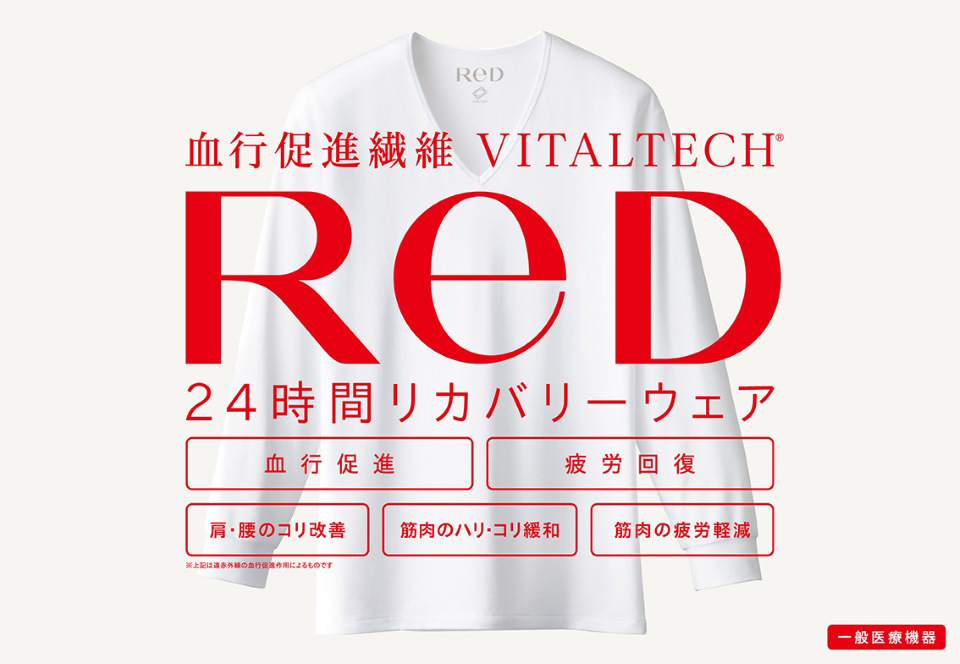 ReDは血行から毎日を元気にする、24時間リカバリーウェアです。8つの天然鉱石を独自配合した「血行促進繊維VITALTECH®」が身体が放出する遠赤外線を吸収し、再び肌へ放出することで血行を促進。健康で美しく生き生きとした人生=VITAL LIFEを応援します。ReD公式サイト:https://www.mtgec.jp/red/shop/