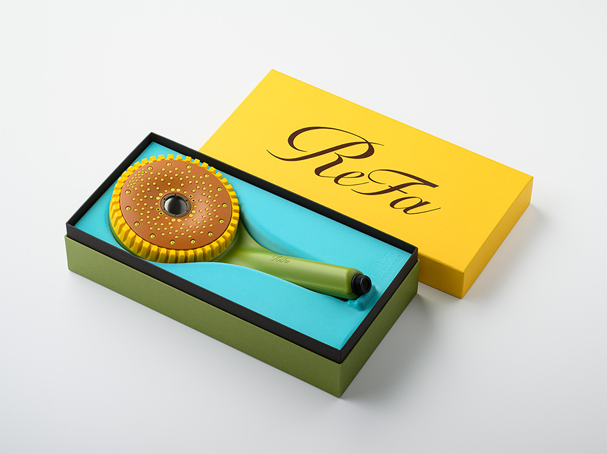 ファインバブルシャワーヘッドのなかのラグジュアリーモデル「リファファインバブル ダイア 150」が、ひまわりを思わせる造形美を帯びていることから誕生した限定カラーモデル。本商品名のSFはSUNFLOWER(ひまわり)が由来です。空間を明るく彩ることで、心が晴れるようなバスタイムを演出しながら、150mmのワイドヘッドから生まれる爽快な浴び心地が楽しめる特別な1本です。