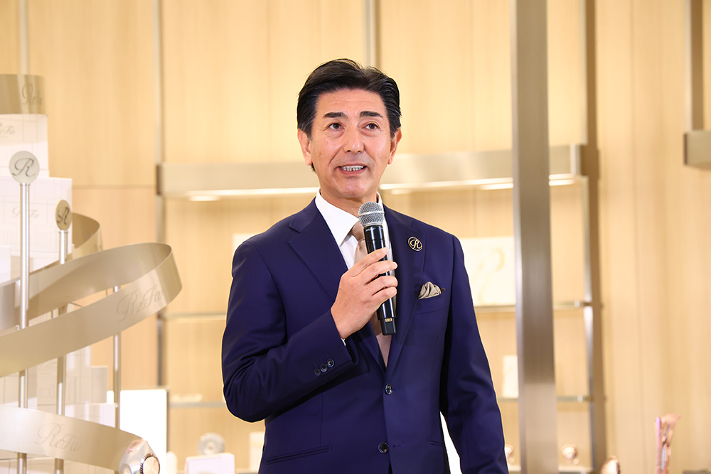セレモニーの冒頭では、"生命力あふれる美"を鼓動として表現した店内中央のスフィア下に代表取締役社長 松下が登壇。ReFaが誕生してから16年間、多くの方に支えられて今日という日を迎えられたことへの感謝を述べたあと、「ビューティーローラーから始まり、今ではドライヤーやヘアアイロンを含む多くのアイテムへとラインナップが広がり、今回はフレグランス、リネン、ウェアなどさらに新しいカテゴリを展開していきます。"Made in Japan" の賑やかなラグジュアリーブランドをここから広げていき、三世代にわたってReFaを愛用してもらいたい。」と語り、最後に「『ReFa GINZA』から羽ばたき、より挑戦していきたい。」と締めくくりました。