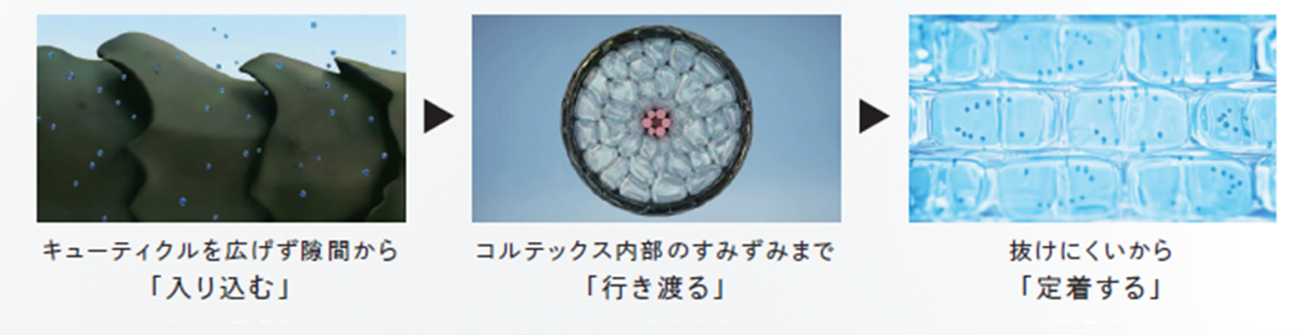 ReFa HYDRAIDから放出された「ハイドレイド」は、キューティクルを広げずに隙間から入り込み、毛髪内部のすみずみまで行き渡ります。そして抜けにくいため毛髪内に定着します。