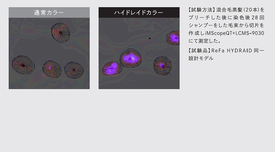 ハイドレイドが浸透・定着することで毛髪内部に薬剤の通り道を形成。カラー剤がムラなく定着することで施術後の美しさが長く続きます。
