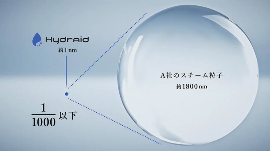 *2 スチーム粒子:2016年当時国内市場で販売されていた他社スチーマーA 粒子サイズ:A社スチーム粒子:約1800nm(測定方法:DANTEC社製 位相ドップラ式粒径流速測定装置) 当社粒子:約1nm(測定方法:ワイコフ科学DMAナノ粒子測定装置)*ハイドレイドは位相ドップラ式粒径流速測定装置では微小なため検出できず。