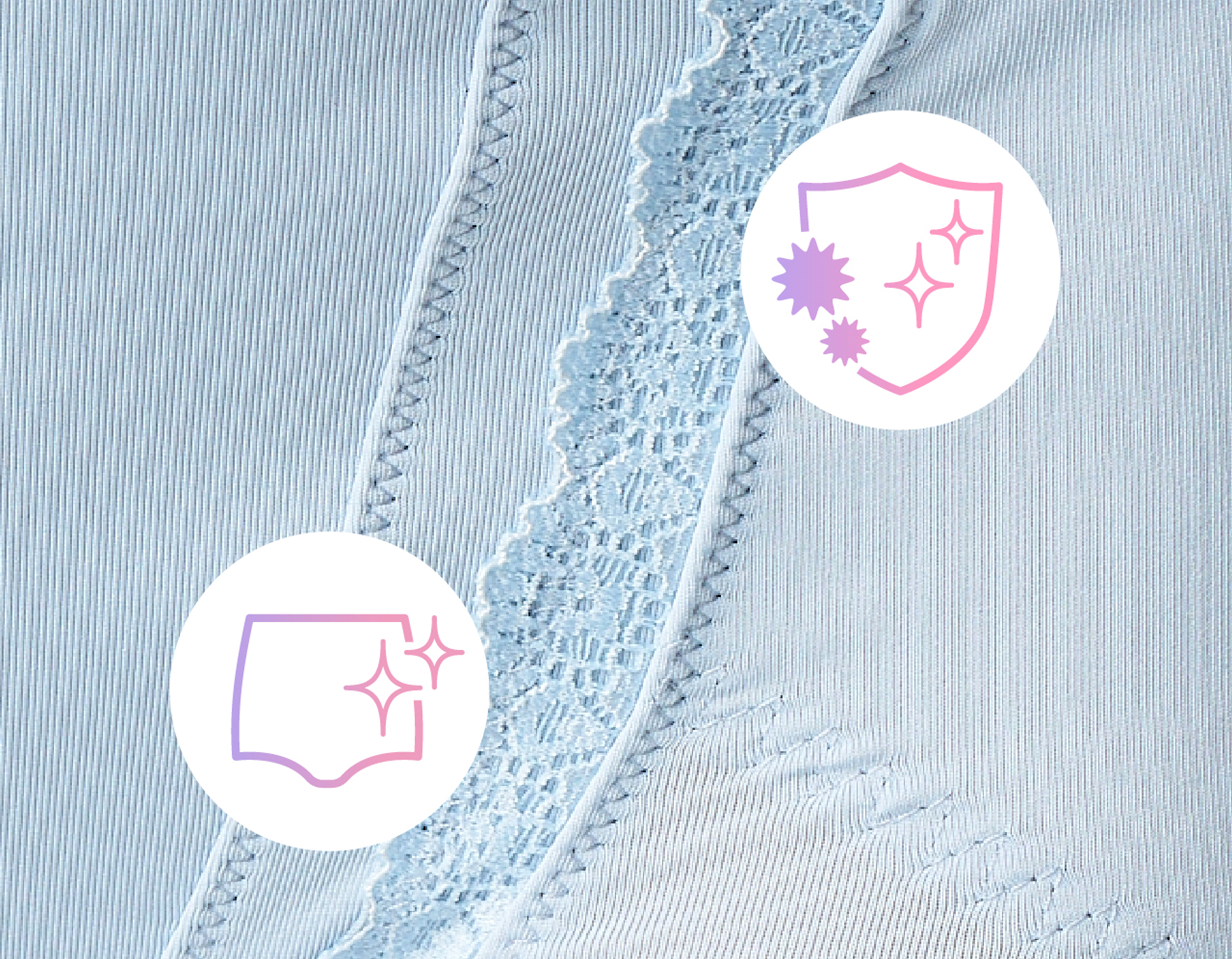 上品なポイントレース付きで、気分の上がる女性らしいデザインです。デリケートな問題だからこそ、毎日の下着として気軽に着用できるデザインにこだわりました。